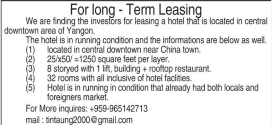 仰光市区中心位置一家酒店拟对外长期租赁,现寻找投资者。