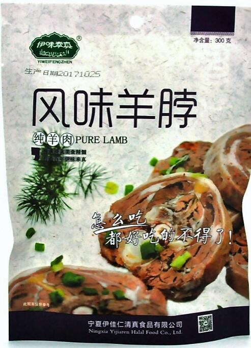 5.风味羊脖 羊脖子,其肌肉发达,肥瘦兼具,肉质紧实并夹有细筋。由于羊脖子是羊随时都要动的部位,肉质比较的瘦,几乎没有脂肪层,所以口感好,营养丰富,不腥不膻,羊脖子上附着于骨节的羊肉肉质细嫩,奇香无比,加上些少许淡黄的羊脖筋,口感丝毫不亚于手抓羊肉,具有很好的大补功能,有补虚益气之功效。加上回族的祖传制作方法,蘸上特制的调料,松软可口,又劲道有力,不可不尝。伊味奉真“风味羊脖”精选宁夏优质羊脖,采用民间传统烹饪方法,经手工制作,肉质具有鲜、嫩和肥而不腻的特点,香醇可口、营养丰富。具有浓郁的宁夏回乡特色,既可作为日常家中正餐菜肴,又便于外出携带,因此特别适合回族同胞出门旅行、远足他乡时食用;还可作为馈赠亲朋好友的上等礼品。